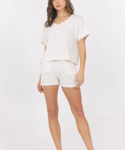 VintageHavana Women’s White Summer Sand Short Sleeve Sweater W/ Whipstitch | White With Summer Sand
