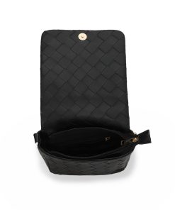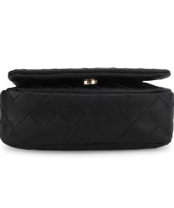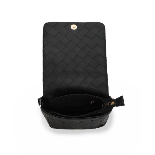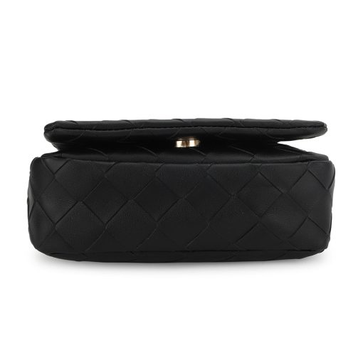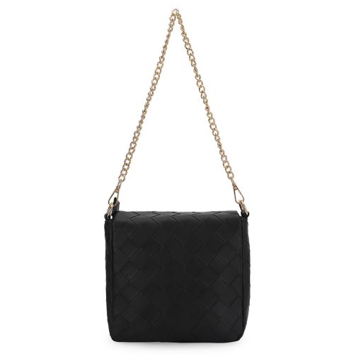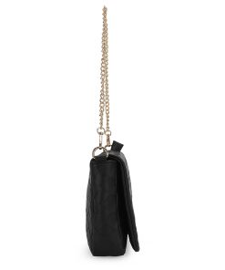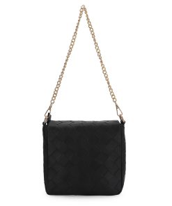 The Allie Bag in black combines sleek design with practical features. It includes a stylish chain shoulder strap for comfortable carrying and a metallic logo that adds a subtle touch of elegance. The snap closure ensures your belongings stay secure while providing easy access. Perfect for everyday use or special occasions, this bag offers both functionality and refined style.