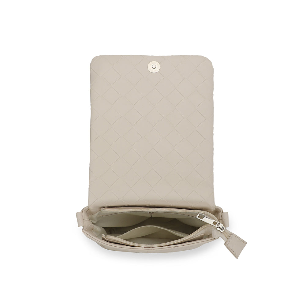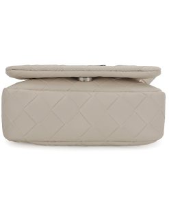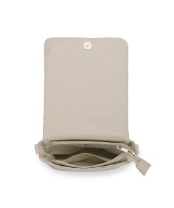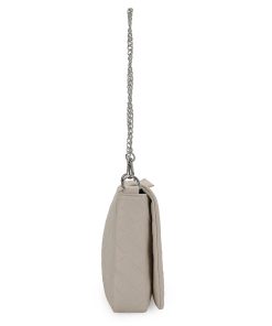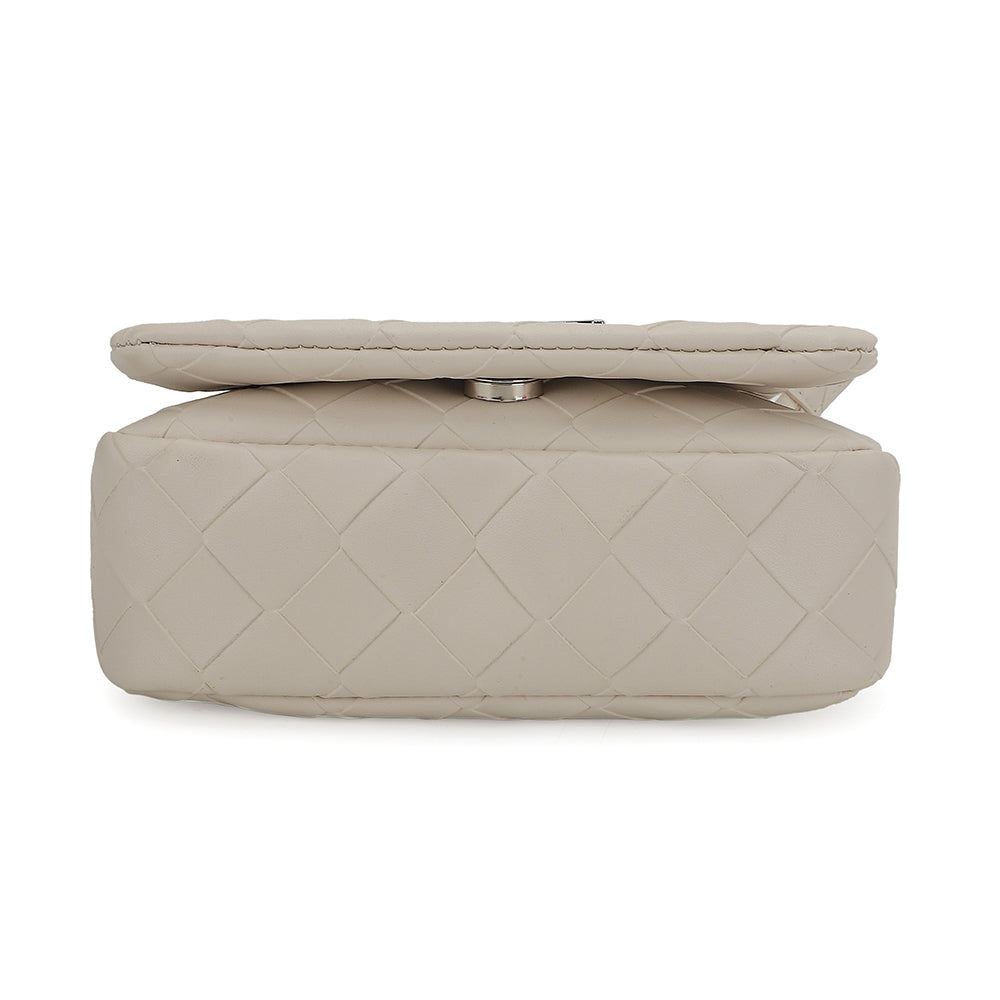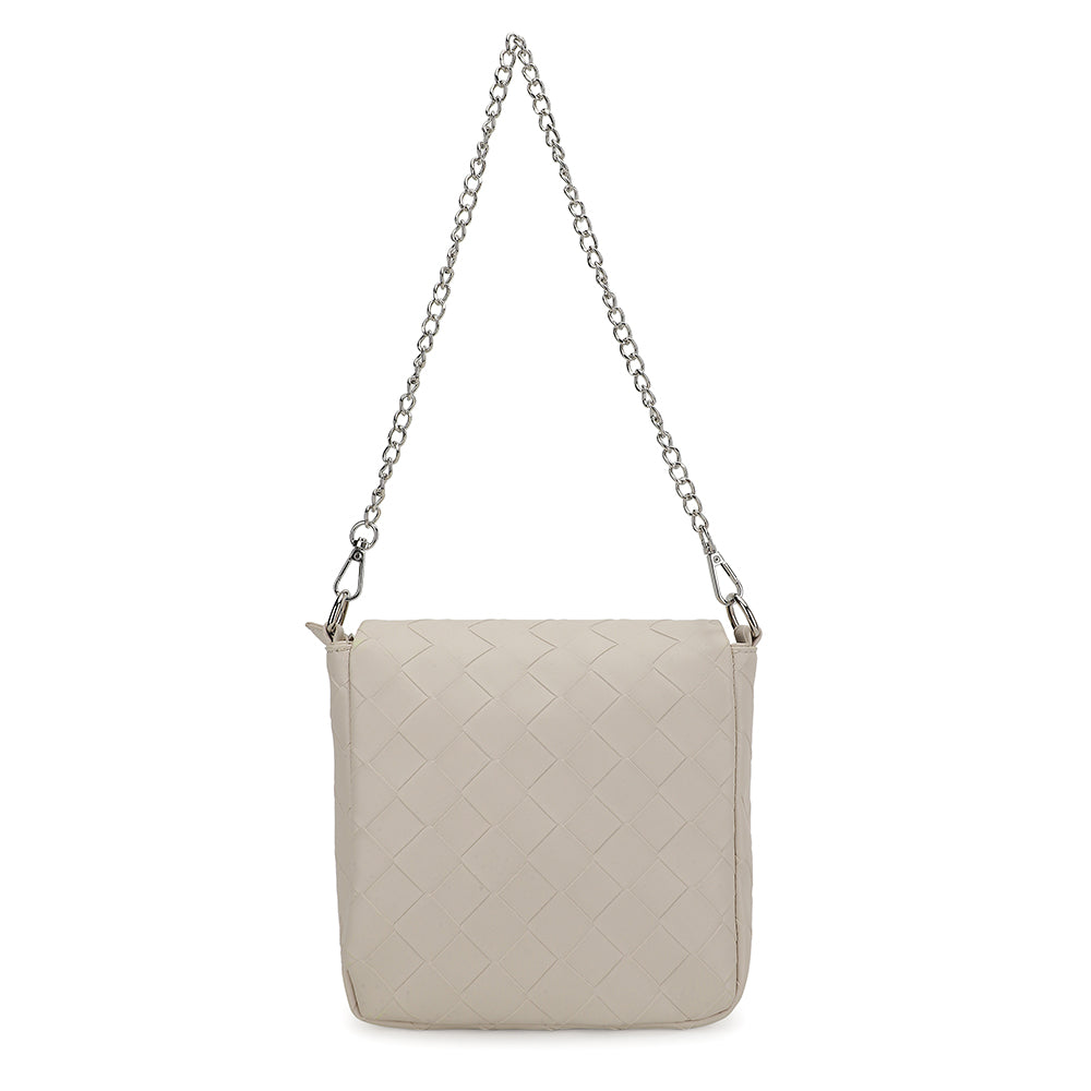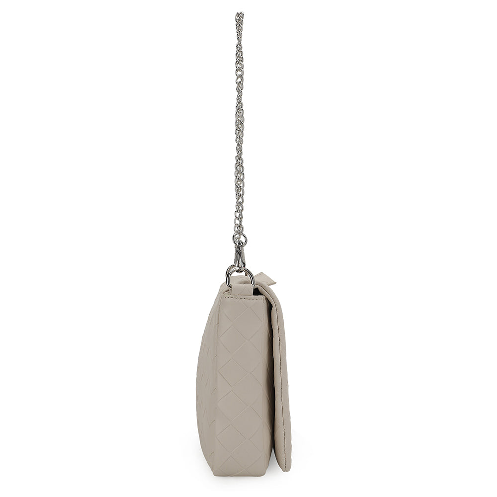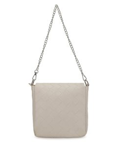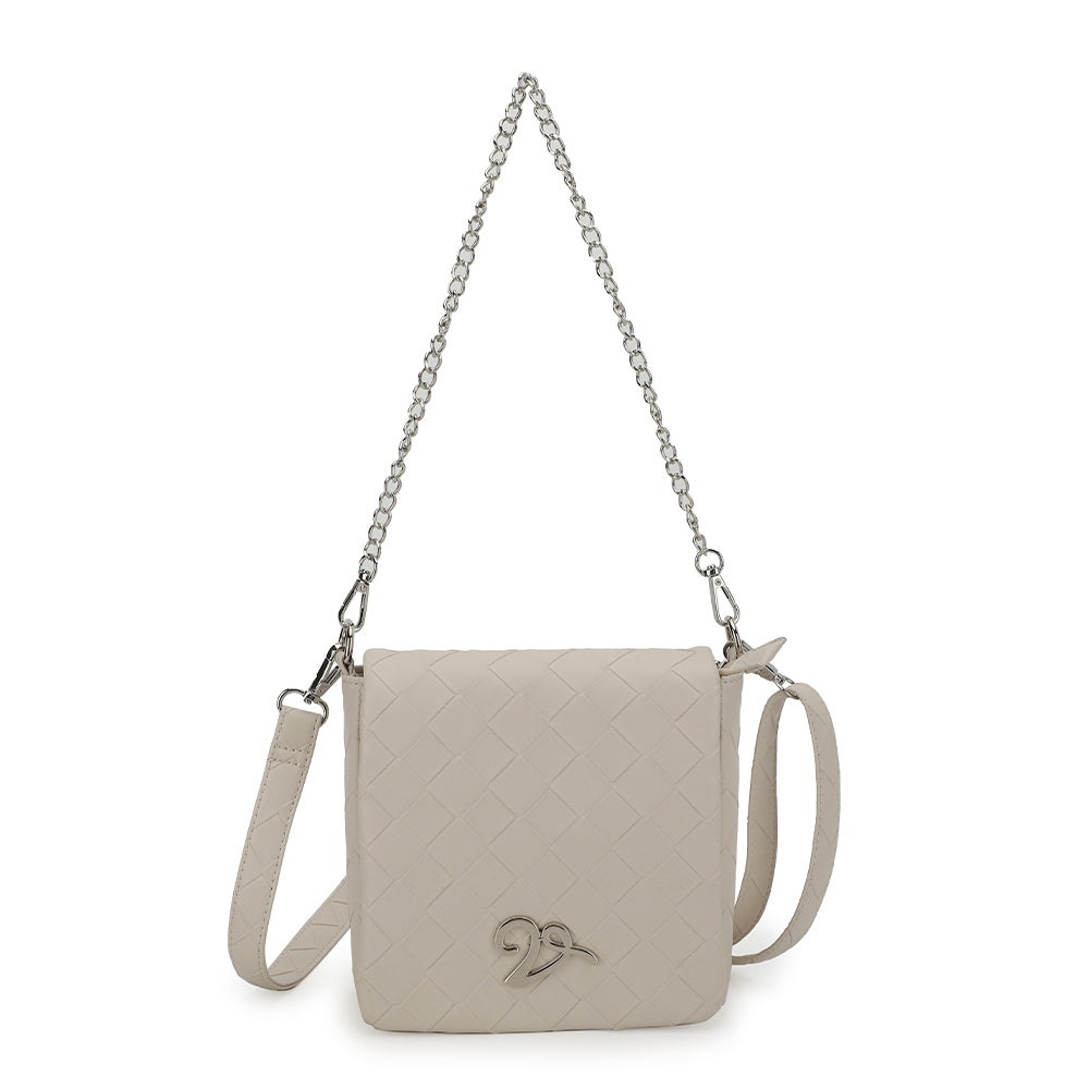 The Allie Bag in white combines sleek design with practical features. It includes a chain shoulder strap for comfortable carrying and a metallic logo that adds a subtle touch of elegance. The snap closure ensures your belongings stay secure while providing easy access. Perfect for everyday use or special occasions, this bag offers both style and functionality.