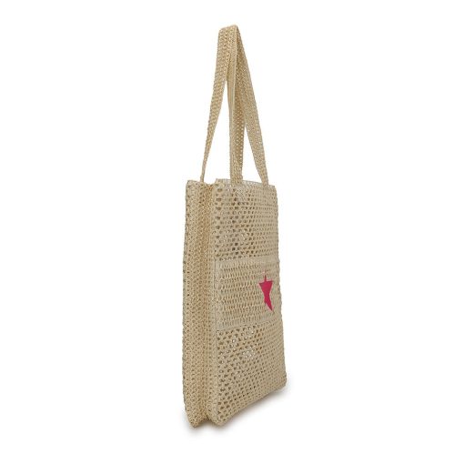 This BASIC BAG 1 combines a chic crochet design with a playful pink star detail, making it a stylish yet versatile tote. The top handle offers easy carrying, perfect for everyday use or casual outings. Its unique texture and subtle color accent add a touch of personality to any outfit.