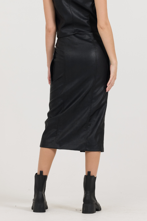 This black leather midi skirt combines sleek style with practical design. Featuring a front zipper for easy wear and a flattering fit, it offers a timeless look suitable for both casual and polished outfits. Crafted from quality leather, it delivers durability and a smooth finish that elevates your wardrobe effortlessly.