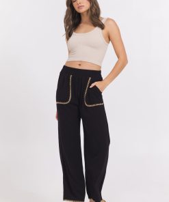 These black wide leg pants feature distinctive tan whip stitch detailing on the pockets, adding a subtle yet stylish touch. The wide leg cut offers comfort and a flattering silhouette, making them a versatile choice for both professional and casual settings. Perfect for elevating your wardrobe with understated elegance.