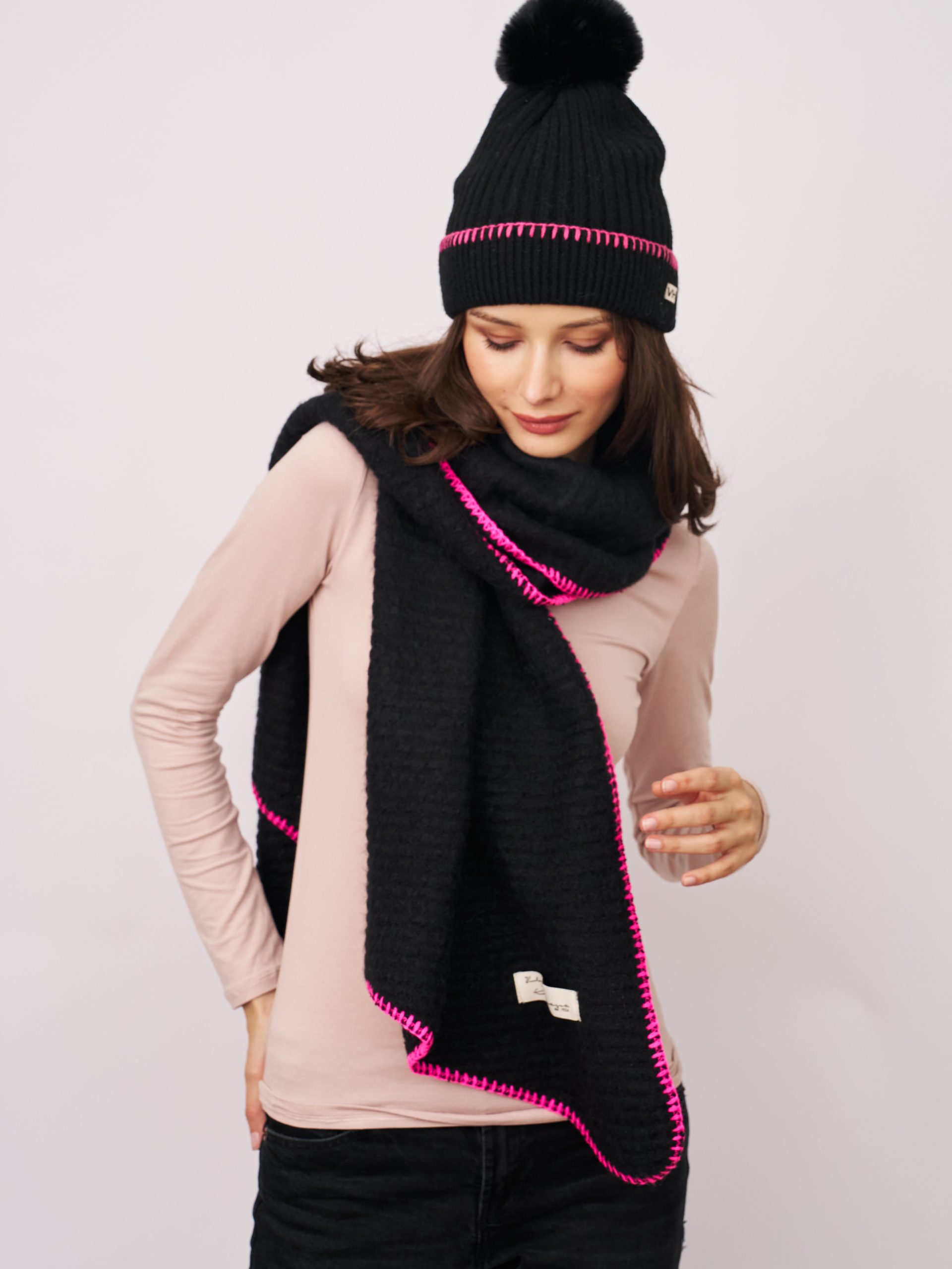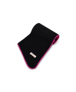 This Blanket Stitch Knit Scarf in Black and Pink features a stylish whipstitch trim that adds a subtle handcrafted touch. Made from 100% recycled polyester, it offers a soft, cozy feel while supporting sustainable fashion. Perfect for adding warmth and a pop of color to your everyday wardrobe with an eco-conscious edge.