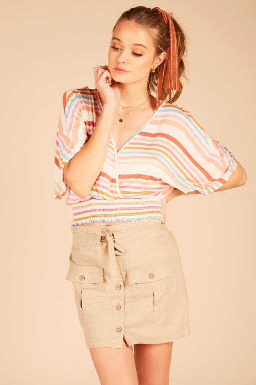 The Cargo Mini Skirt combines comfort and style with its elastic waistband and adjustable tie front for a perfect fit. Crafted from a breathable linen-rayon blend, it features practical button-front closure, spacious cargo pockets, and back pockets for added functionality. Easy to care for, this skirt is machine washable and tumble dry safe, making it an ideal choice for everyday wear with a polished, casual edge.