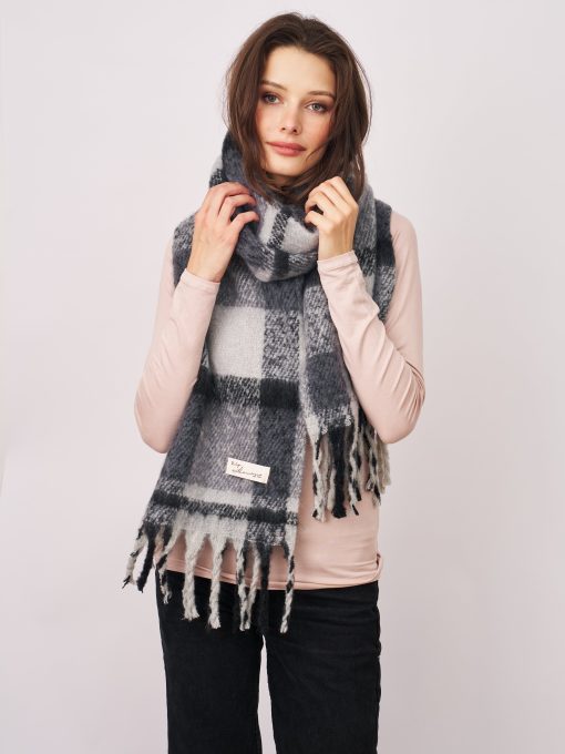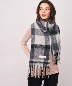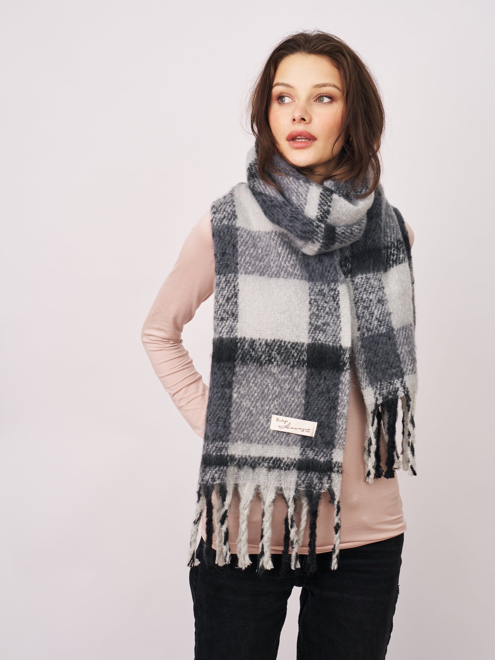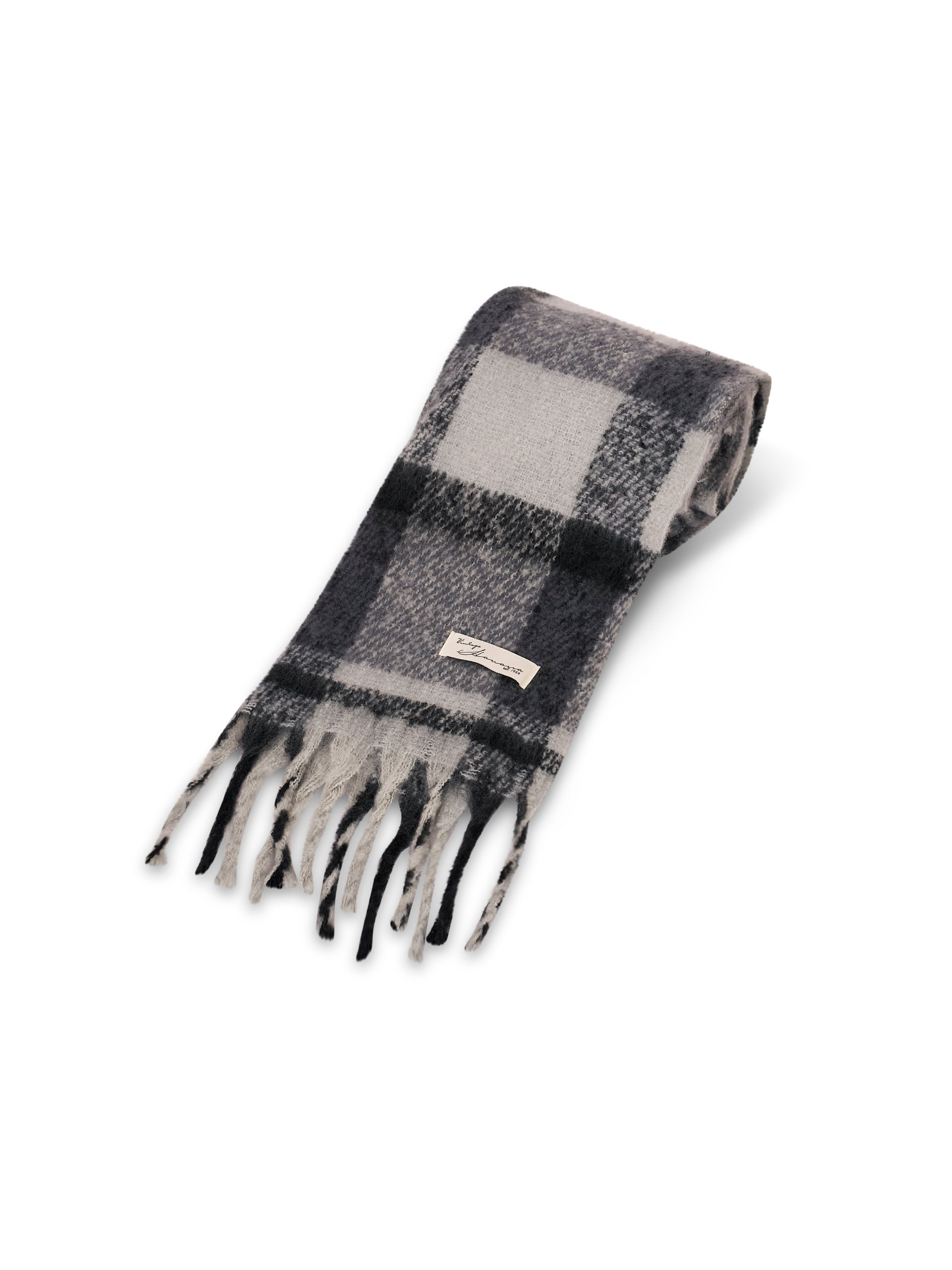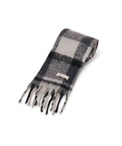 This check brush tassel scarf in black combines classic pattern with soft, brushed polyester fabric for comfortable warmth. Its lightweight design and stylish fringe detail make it a versatile accessory that effortlessly elevates any outfit. Perfect for adding a subtle touch of sophistication to your everyday look.
