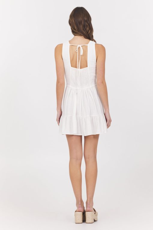 This linen dress features a flattering V-neckline and unique cutout detailing, enhanced by a stylish wooden O ring accent. Its breathable fabric and thoughtful design make it a comfortable yet chic choice for warm days or casual outings.