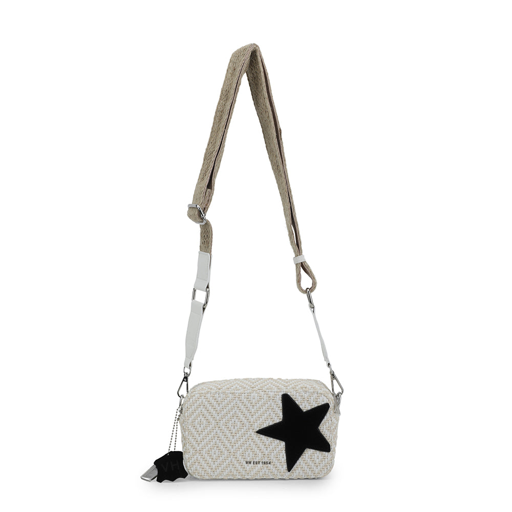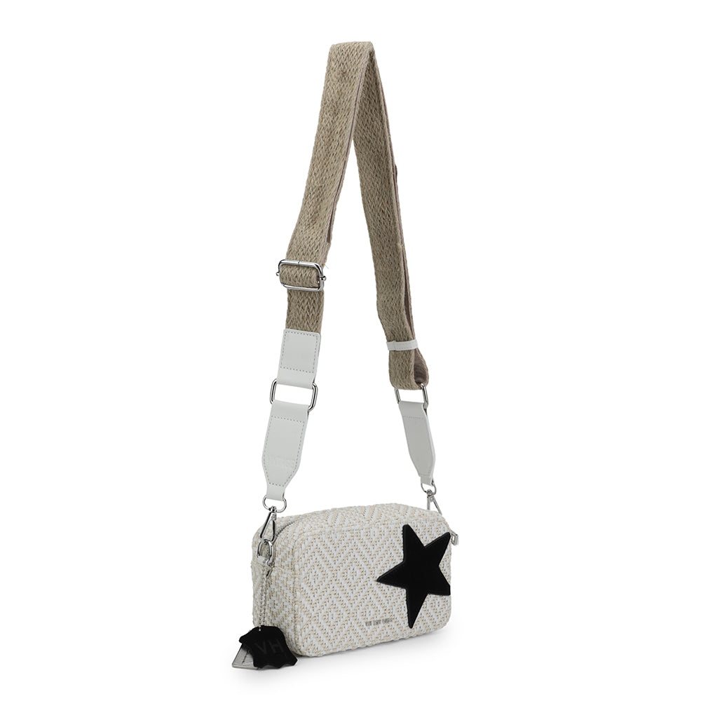 The MINI MEME – WHITE RAFIA MIX combines compact design with stylish details. Featuring an adjustable crossbody strap, it offers versatile wear for hands-free convenience. Its mini size is perfect for carrying essentials, while the subtle star detail adds a touch of personality to your look. Ideal for those seeking a chic yet practical accessory.
