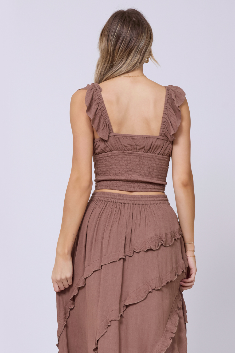 The Washed Mocha Rayon Crinkle Flutter Sleeve Top features: