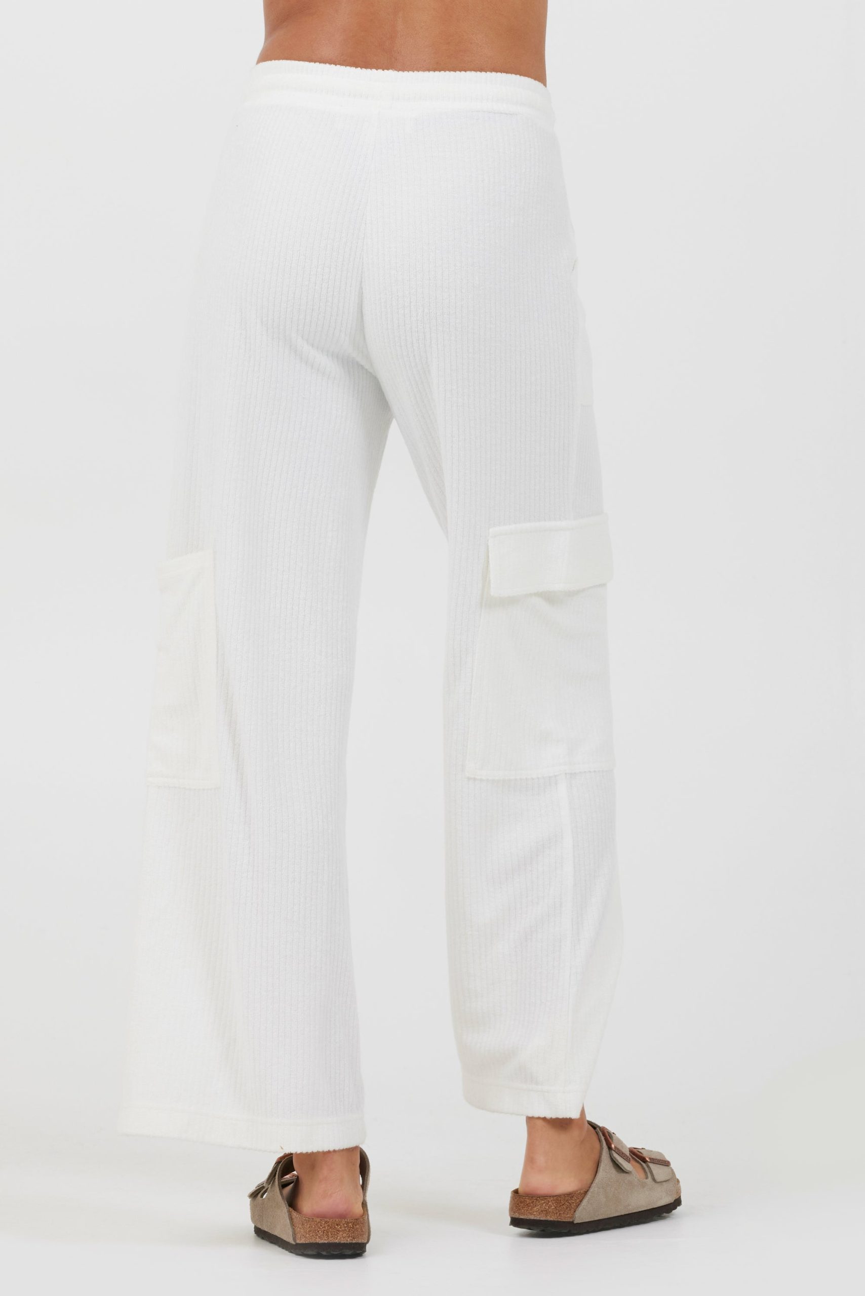 The White Cord Terry Cargo Pants combine comfort and functionality with an adjustable drawstring waistband for a perfect fit. Designed with practical front and cargo pockets, they offer ample storage while maintaining a clean, casual look. Ideal for everyday wear, these pants provide versatility without compromising style.